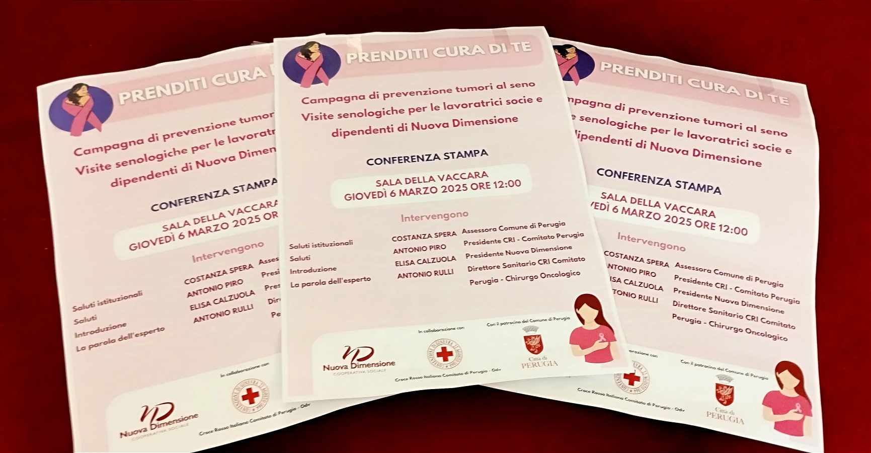 Una nuova e importante iniziativa, dal titolo “Prenditi cura di te”, a favore della salute delle proprie lavoratrici, socie e dipendenti. E’ la campagna di prevenzione contro il tumore al seno ideata e presentata a Palazzo dei Priori dalla Cooperativa Nuova Dimensione di Perugia (aderente a Confcooperative Umbria) in collaborazione con il Comitato perugino della Croce Rossa Italiana. L’iniziativa, al via volutamente nei giorni a ridosso della Giornata Internazionale della Donna, si propone di sensibilizzare le lavoratrici sulla prevenzione del tumore al seno e di offrire loro l’opportunità di sottoporsi gratuitamente a visite senologiche.