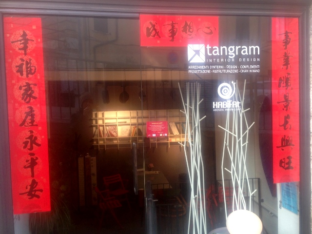 Festoni tipici cinesi, chunlian 春联, sulle vetrine dei negozi del centro storico di Perugia. L’occasione è quella del Capodanno cinese che cade proprio sabato 28 gennaio e determina l’entrata dell’anno del Gallo dopo dodici mesi in compagnia della Scimmia.