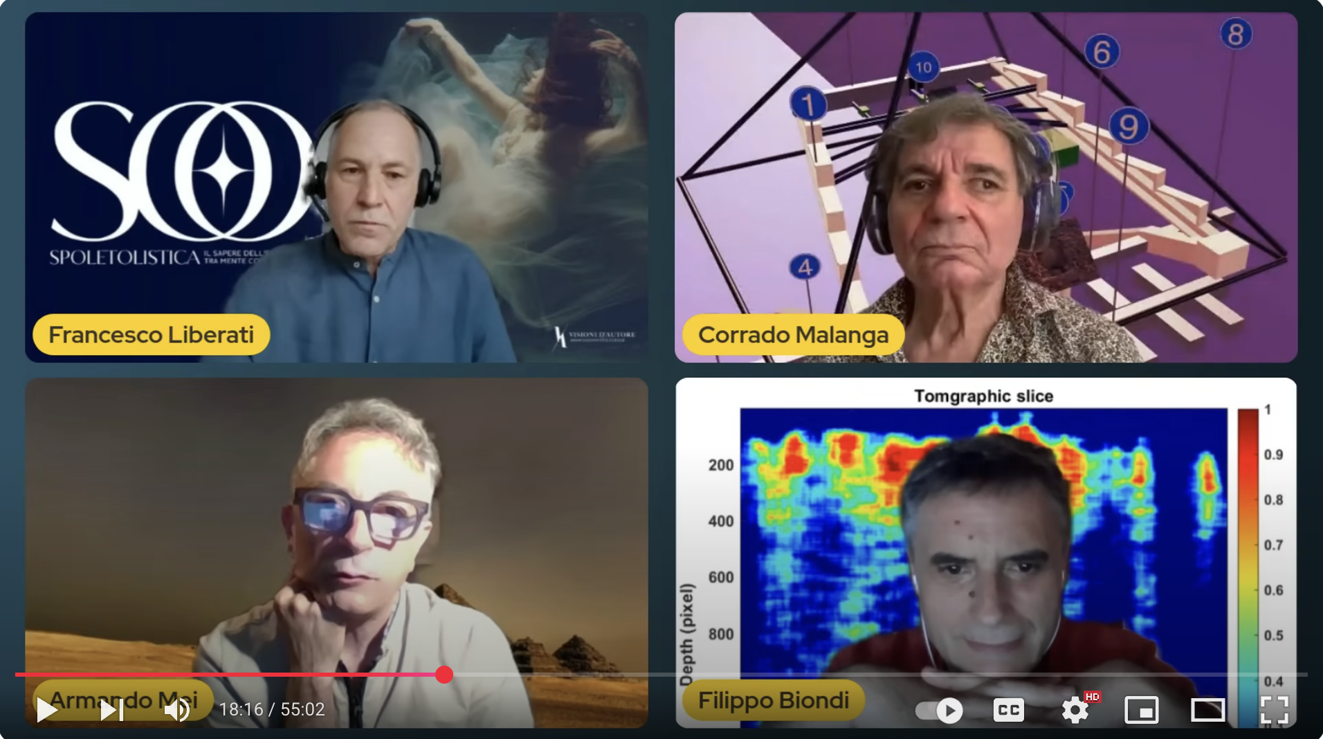 Protagonisti di questa indagine: Corrado Malanga, chimico e teorico della coscienza, Filippo Biondi, ingegnere delle telecomunicazioni, e Armando Mei, egittologo e ricercatore multidisciplinare. A intervistarli, sono stati Francesco Liberati, presidente dell’associazione culturale Visioni di Autore, e Elisabetta Severini, ideatrice del contenitore culturale Spoleto Olistica, che organizzeranno il prossimo evento pubblico “Giza, la punta dell’iceberg”, il 27 luglio a Spoleto.