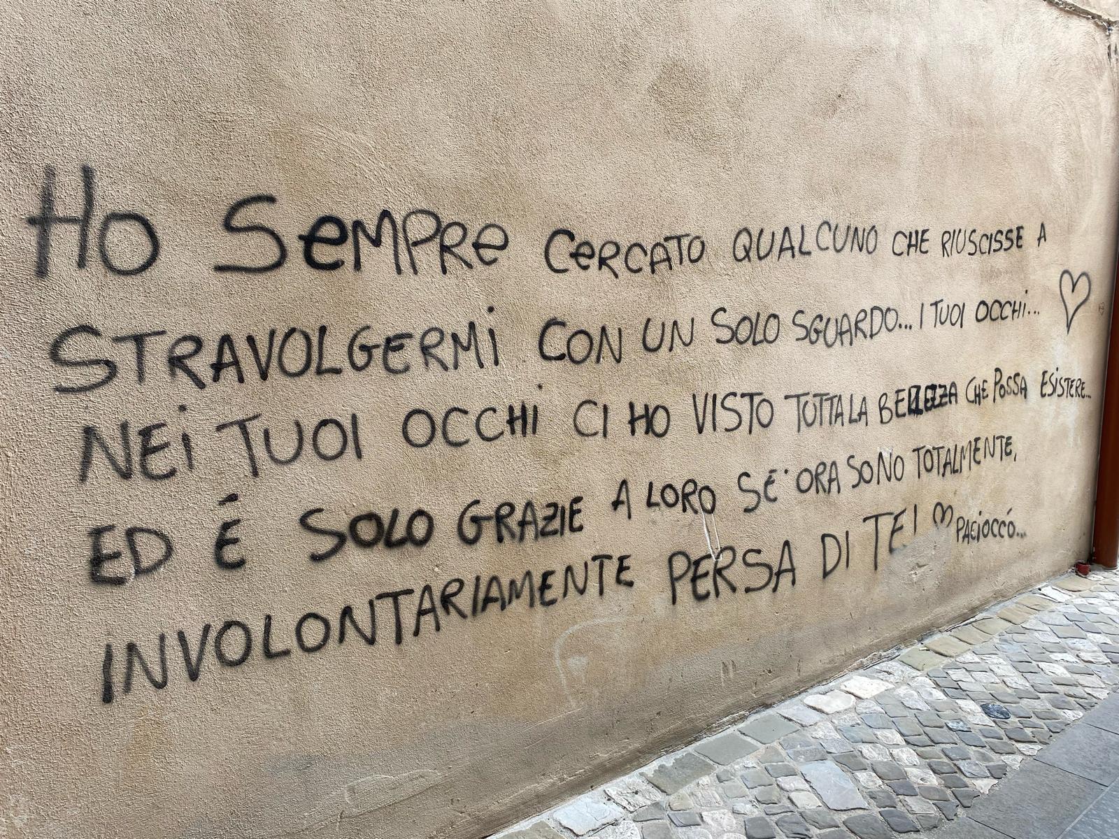 Sono sempre più frequenti i luoghi della città dove spuntano dediche d’amore e frasi motivazionali. Spesso in concomitanza delle scuole, ma questo non è sempre vero. Ed è così che, passeggiando per i vicoli del centro storico, l’ignaro visitatore si è imbattuto nel componimento d’amore: “Ho sempre cercato qualcuno che riuscisse a stravolgermi. Con un solo sguardo…i tuoi occhi…nei tuoi occhi ci ho visto tutta la bellezza che possa esistere ed è solo grazie a loro se ora sono totalmente, involontariamente persa di te! Pacioccò”.