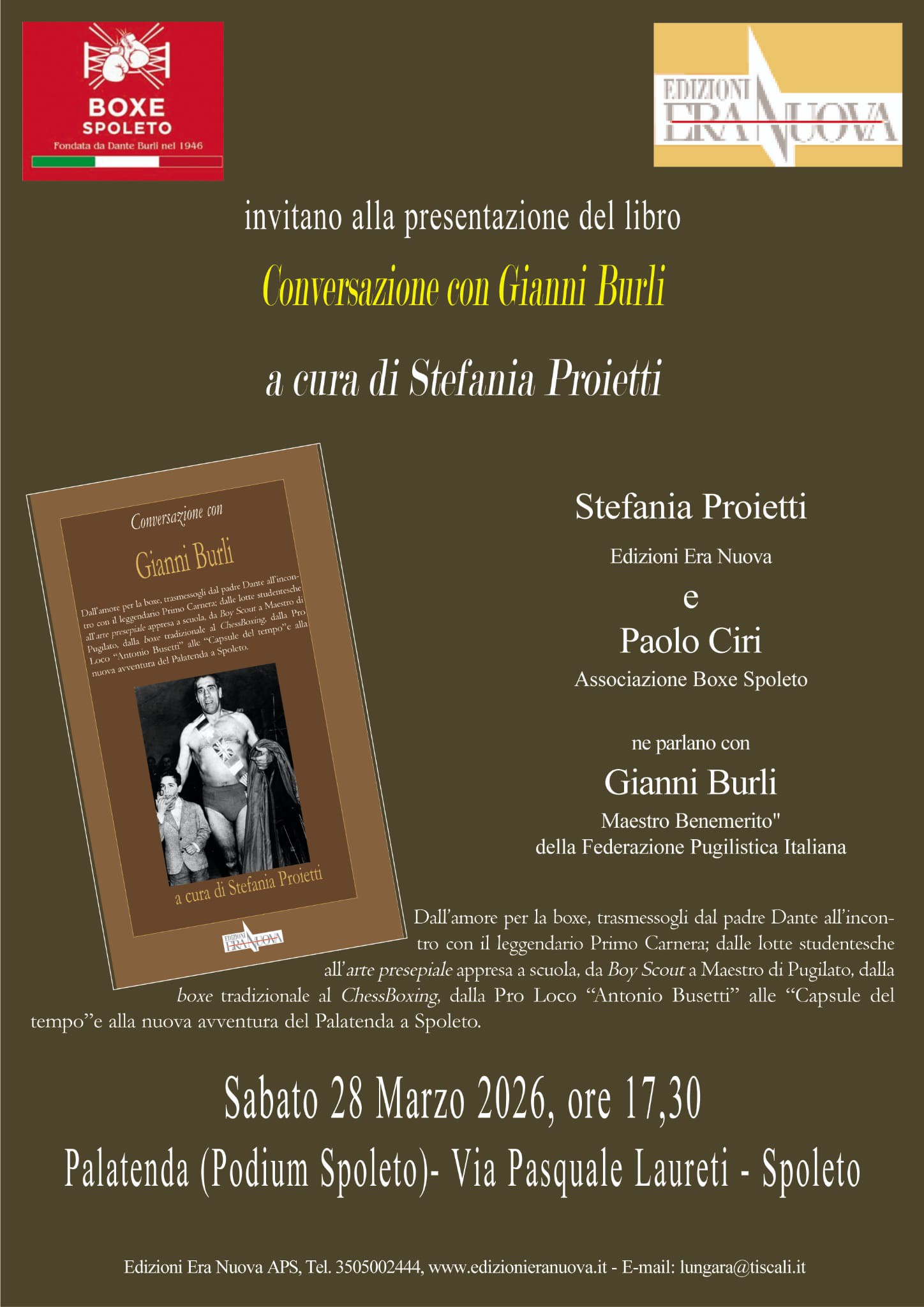 Il libro, della casa editrice Era Nuova, sarà presentato da Gianni Burli, da Stefania Proietti e da Paolo Ciri, vicepresidente della Boxe Spoleto, sabato 28 marzo alle ore 17,30 presso il Podium, palestra di pugilato, avviamento con ingresso libero a chiunque.