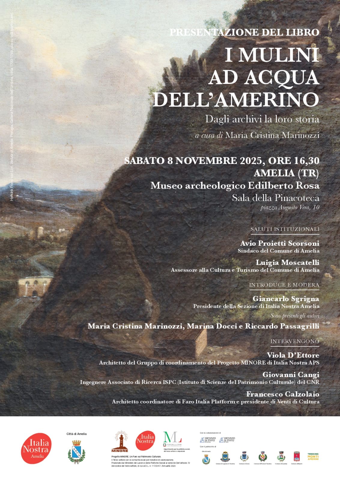 Italia Nostra Amelia, in collaborazione con il Comune di Amelia, presenta sabato 8 novembre, alle ore 16.30, presso la Pinacoteca del Museo archeologico Edilberto Rosa di Amelia il volume “I mulini ad acqua dell’Amerino. Dagli archivi la loro storia” realizzato da Italia Nostra Amelia nell’ambito del Progetto MINORE Un faro sul Patrimonio Culturale, curato dalla vicepresidente, architetto Maria Cristina Marinozzi.