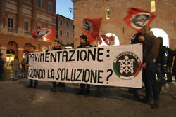Un presidio per affermare la propria contrarietà agli interventi di pavimentazione del centro storico di Foligno, attuati in queste settimane dall'amministrazione comunale,lavori che – a detta del movimento Casapund – “non vengono incontro alle necessità dei commercianti e dei residenti, già duramente colpiti dalla crisi, finendo per paralizzare anche a livello viario la terza città dell'Umbria”. “Scendiamo in piazza per solidarizzare con le posizioni da tempo espresse dalle categorie sociali ed economiche della città – dichiara il responsabile folignate Saverio Andreani – quest'amministrazione ha attuato scelte scellerate, senza procedere ad alcun confronto preliminare e riuscendo nel duplice e disastroso risultato, di coalizzare il malcontento di residenti e commercianti e rendere difficoltosa la circolazione, i parcheggi e la viabilità dell'intera città. I cantieri per la nuova pavimentazione infatti, lungi dal rappresentare una priorità per i cittadini, finiranno per dare il colpo di grazia. La tempistica è sbagliata e deleteria, incapace di incentivare le vere necessità di chi vive e lavora in città, ossia vedere valorizzata la propria attività e non doversi in tal modo trovare costretti a chiudere. Casa Pound Italia – conclude Andreani – esprime la necessità di un approccio diverso e partecipativo alle scelte che impattano sulla quotidianità della popolazione”.