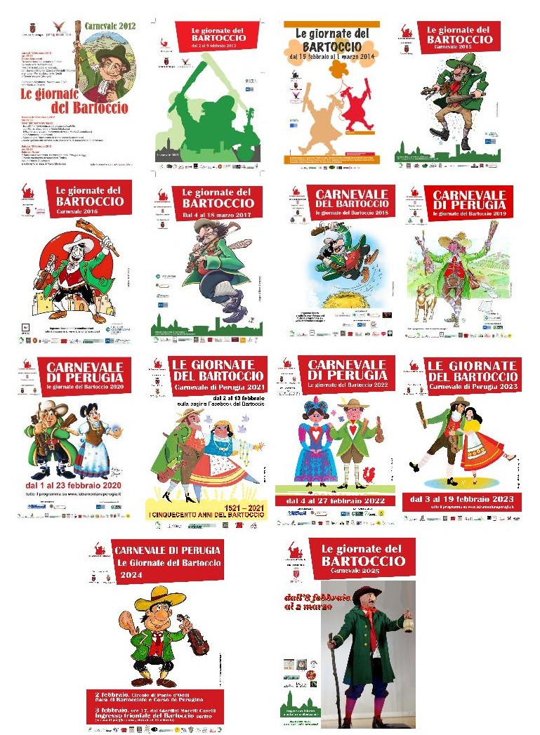 Si tratta delle immagini del Bartoccio disegnate da bravissimi disegnatori, che hanno interpretato di anno in anno la maschera perugina secondo il loro personale punto di vista, ma sempre mettendone in evidenza il carattere schietto, burbero ma giocoso, irrispettoso e mordace.