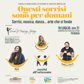 L’Associazione di promozione sociale Sorrisi all’Orizzonte presenta un nuovo evento benefico dal titolo “Questi sorrisi sono per domani“, in programma giovedì 10 luglio 2025, alle ore 21.00, presso l’Auditorium di San Francesco al Prato a Perugia.