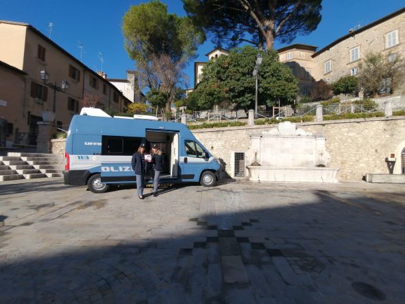 Il camper con gli operatori della Questura di Terni è rimasto, a partire dalle 9.30, davanti al Comune di Sangemini.
