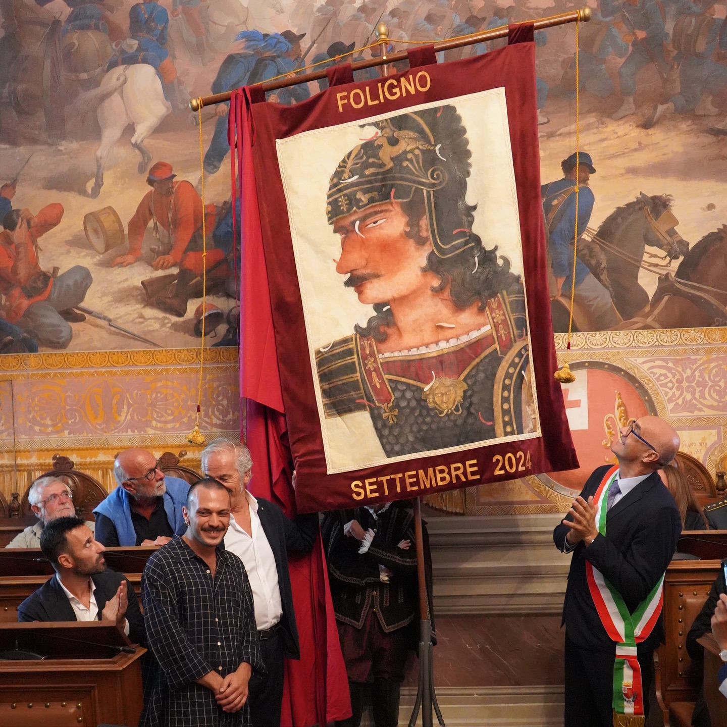 Primo Badia, dunque. Poi Contrastanga, la Mora, Giotti, Ammanniti, Spada, Croce Bianca, Cassero, Pugilli, Morlupo. Ieri anche la presentazione del Palio della Rivincita, dedicato al Dio Marte e realizzato da Roberto de Pinto. Di origini pugliesi, Roberto nasce a Molfetta nel 1996 e si trasferisce a Milano per studiare a Brera, dove si diploma nel 2021. All’accademia sviluppa uno stile personale basato soprattutto sull’utilizzo dell’encausto, ovvero cera mescolata a pigmenti, una tecnica pittorica molto antica e utile nella resa della pelle e dell’incarnato. “I soggetti dei suoi dipinti sono quasi sempre figure in cui è possibile riconoscere multipli alter ego dell’artista stesso, spesso accompagnati da fiori, elementi vegetali, libri e oggetti presi dalla sua vita quotidiana. Le atmosfere richiamano ambientazioni mediterranee, calde, sensuali, silenziose e sospese, in cui i colori sfumati e i giochi di ombre hanno un ruolo da protagonista. Per la Giostra della Quintana di Foligno – scrive il critico Antonio Grulli – de Pinto ha scelto di concentrarsi sulla statua del dio Marte, protagonista della Giostra, circondandolo di piccoli petali del colore degli anelli della storica manifestazione. Una scelta dettata dalla coincidenza di sembianze della statua della divinità con le figure solitamente ritratte dall’artista. Il drappo diventa in tal modo un vero e proprio ritratto di un elemento inanimato ma sul quale un’intera comunità, riunita attraverso le proprie tradizioni, ha proiettato negli anni emozioni, desideri, paure, gioie e delusioni, rendendolo un personaggio quasi dotato di una propria psicologia da indagare con l’arte, protagonista di una storia popolare in grado di crescere di anno in anno”.