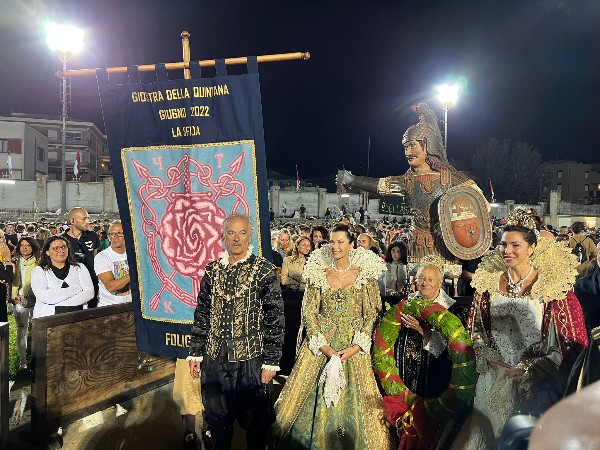 Immancabili anche gli striscioni e gli sfottò, come quello dello Spada indirizzato al Pugilli. I primi ingressi intorno alle 21.15 con il Rione Cassero ad aprire, come da cerimoniale, per il quale il corteo va aperto dal Rione vincitore della Quintana precedente. Segue il contrastanga con il Priore Carlo Mattioli e Silvia Romagnoli dama. Poi via di seguito fino all’ultimo rione, La Mora, che poi per l’ordine di partenza è quello che avvierà la tornata. Al Campo una leggera brezza che ha reso la temperatura piacevole e sopportabile, rispetto al clima pomeridiano, ma che potrebbe anche dare qualche problema ai fantini, nel percorso dell’otto di gara. Meravigliose come sempre le due madrine, Federica Moro ed Eleonora Pieroni, vestite di abiti maestosi. Come di consueto anche il tributo ai rionali che non ci sono più. Questa volta il ricordo a due donne: la signora Marcella cuoca del Rione La Mora e moglie di Alceste Viola e per il Rione Pugilli, Maria Gabriella Marchionni, per anni dama del Rione. Due donne che hanno contribuito al successo della Giostra.