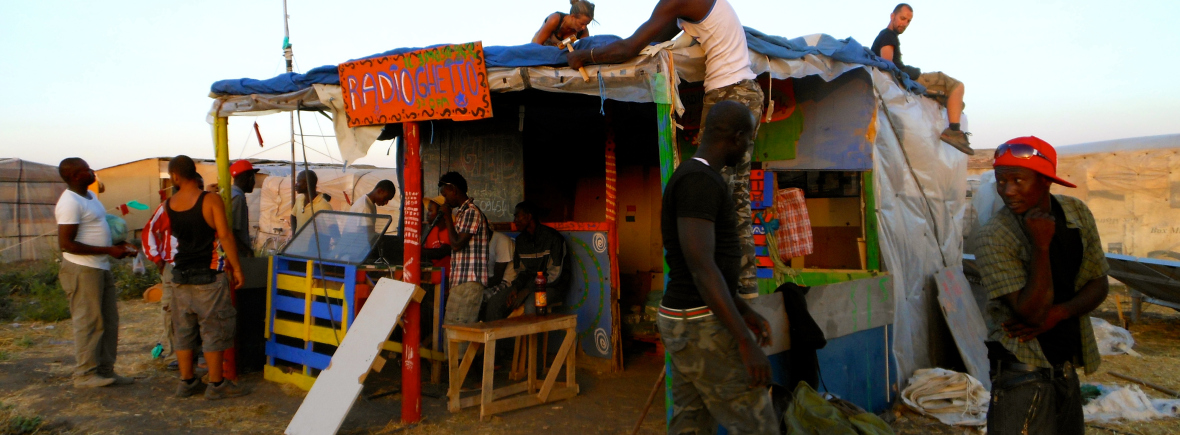 Frequenza 97.0 per i ragazzi di Radio Ghetto: dal 2012, le campagne pugliesi hanno una voce. E’ stata la Rete Campagne in Lotta, dopo i fatti Rosarno, a portare nella baraccopoli pugliese tutta la strumentazione necessaria per l’avvio delle trasmissioni. Giorno dopo giorno, la radio ha continuato a trasmettere tutte le estati, soprattutto durante il periodo della raccolta dei pomodori nelle campagne del foggiano, “cercando di diventare uno strumento di comunicazione e dibattito privilegiato tanto all’interno del Ghetto, tra i suoi abitanti, quanto all’esterno, verso la società italiana“. Durante le trasmissioni radio, sono i braccianti africani che vivono e lavorano al Gran Ghetto di Rignano Garganico a raccontare le loro condizioni di vita e di impiego nelle campagne. Si ascoltano musica e radio-giornali, si condividono le problematiche relative al proprio personale percorso migratorio e alla vita quotidiana in Italia, si organizzano contest per i rapper e i cantanti che vivono al Ghetto. Uno spazio libero, come una volta esistevano le radio “libere”, per discutere, rilassarsi, scherzare, arrabbiarsi e immaginare alternative possibili.