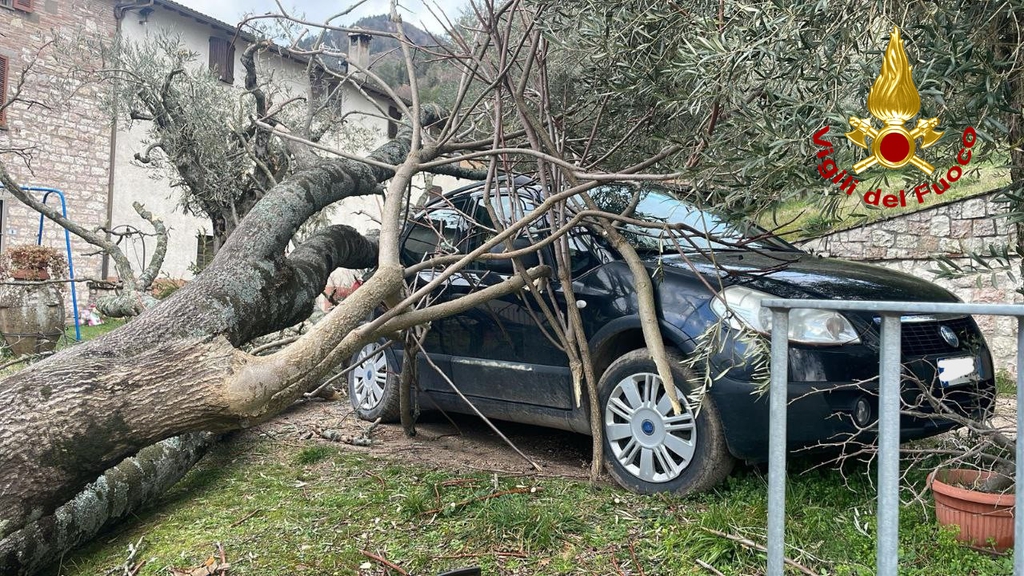 Sempre a causa delle avverse condizioni meteorologiche, i Vigili del fuoco sono stati successivamente impegnati in un intervento nel Comune di Gubbio, dove una pianta è caduta su un’auto e sulla recinzione adiacente a un’abitazione. Fortunatamente, non si registrano danni a persone.