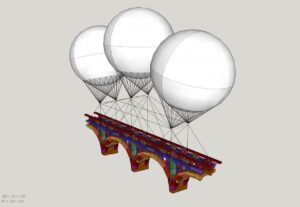 Per il Ponte Farnese, Grossetete si è ispirato al progetto che nel XVI secolo venne commissionato a Michelangelo da Papa Paolo III con l’intento di creare un collegamento tra Palazzo Farnese e i giardini che la famiglia possedeva sull’altra sponda del Tevere, dove oggi sorge Villa Farnesina, sede dell’Accademia dei Lincei. Abbandonato alla morte di Papa Paolo III, il progetto rivive oggi con una modalita artistica basata sul principio della partecipazione collettiva, riprendendo i tratti del progetto di Michelangelo di cui l’unico segno esistente è l’arco dei Farnese di via Giulia.