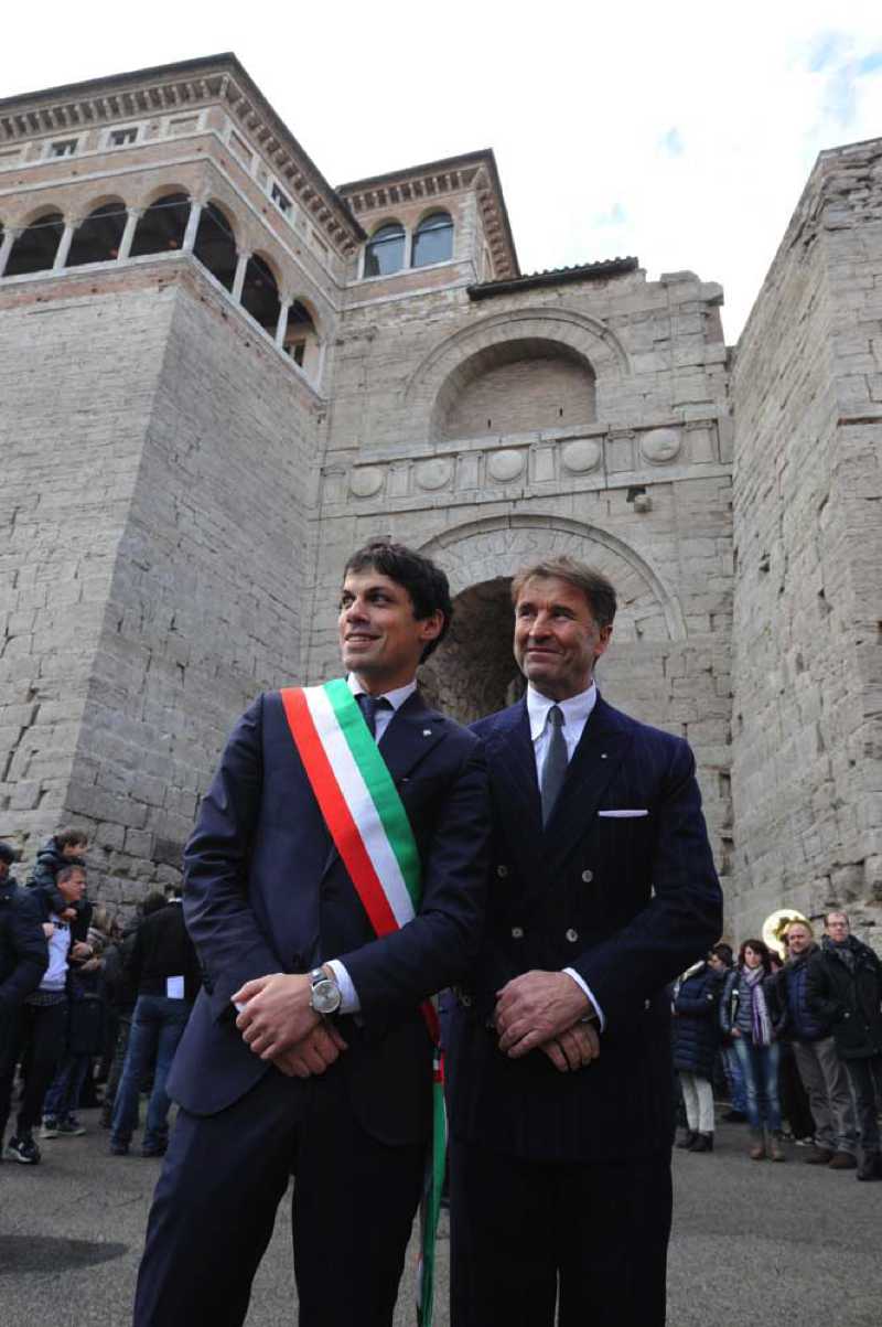 Dopo il Colosseo, l’Arco Etrsuco di Perugia: è l’imponente monumento che si affaccia su Piazza Grimana a essere stato definito il secondo restauro di un bene storico e artistico realizzato con i soldi di un mecenate privato. Chiamato anche Arco di Augusto, monumentale porta che domina la prima cinta muraria di Perugia, è stato riconsegnato alla cittadinanza festante, con il sindaco Romizi e chi ha voluto e finanziato tale meraviglia, ossia il Mecenato patron del cashmere, Brunello Cucinelli, il quale ha interamente finanziato il maquillage, costato 1,3 milioni e durato più di due anni. Presente anche l’ex sindaco di perugia, Wladimiro Boccali, che nella precedente legislatura volle fortemente la realizzazione del restauro.