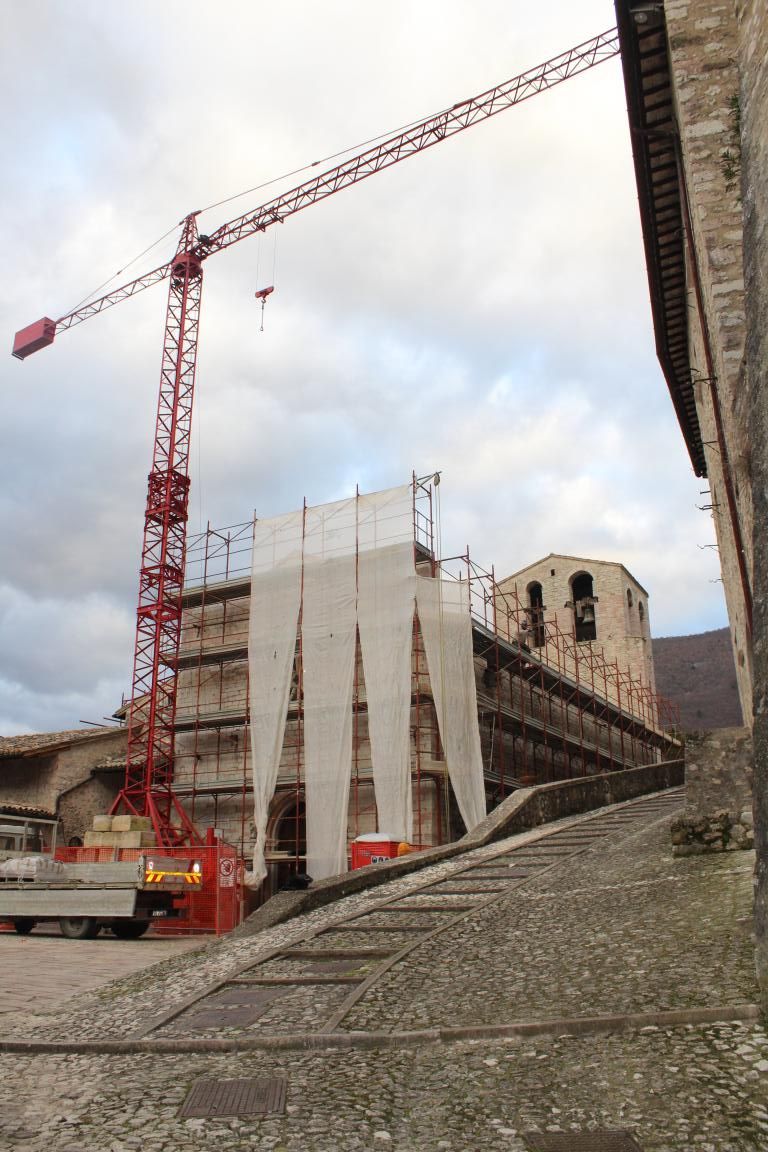 Gli interventi post sisma 2016 sono stati finalizzati al consolidamento statico generale per la completa rifunzionalizzazione dell’edificio, attraverso lavori puntuali e mirati alla risoluzione dei danni causati dagli eventi sismici: interventi strutturali locali che hanno riguardato principalmente il consolidamento e nuovi appoggi delle capriate esistenti, cerchiature dei muri con profilati in acciaio all’interno della muratura stessa, perfori armati verticali ed orizzontali sia sulla facciata principale che nelle pareti laterali, consolidamento della torre campanaria e consolidamento dell’apparato pittorico lesionato dal sisma.