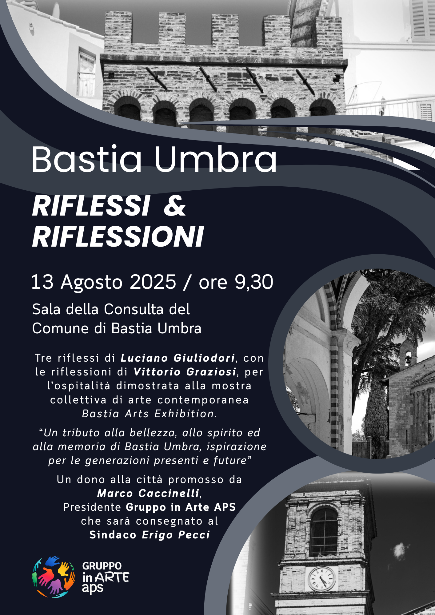 Due noti artisti dell’Associazione Gruppo in Arte APS – il fotografo Luciano Giuliodori di Osimo (AN) e lo scrittore Vittorio Graziosi di Jesi (AN) – hanno deciso di lasciare un segno tangibile alla città, donando una selezione di tre fotografie in bianco e nero, arricchite da didascalie letterarie. Le immagini, scelte sotto il coordinamento del presidente Marco Caccinelli, immortalano scorci suggestivi di Bastia Umbra: la Chiesa di Santa Croce, la Porta di Sant’Angelo e la Chiesa di San Paolo.