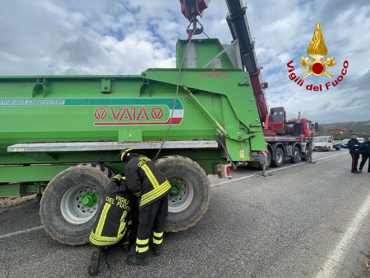 Sul posto è stata inviata una squadra operativa supportata dall’autogru proveniente dal comando di Perugia per le operazioni di sollevamento e rimozione del mezzo. Non si segnalano persone coinvolte. Presenti i Carabinieri di Marsciano per i rilievi e la gestione della viabilità. L’intervento è ancora in corso.