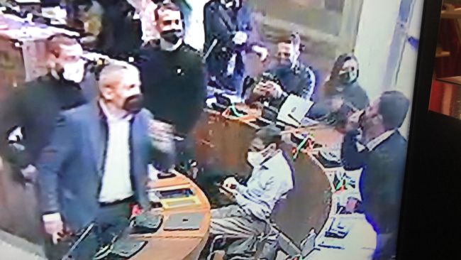 Il presidente del consiglio, Francesco Maria Ferranti, ha osservato l’esattezza dell’intervento del consigliere Simonetti, proponendo la sospensione di un minuto dei lavori. A questo punto è scoppiato il caos: l’assessore Orlando ‘Furioso’ Masselli si è scagliato contro i gruppi di minoranza al grido di “Buffoni”, fermato dal ‘placcaggio’ stile rugby del capogruppo del Pd, Francesco Filipponi, che ha evitato il ‘contatto’ tra lo stesso assessore e il gruppo di minoranza. Sono comunque volati insulti e alcuni consiglieri, compreso il presidente Ferranti, sono dovuti intervenire per scongiurare ‘il peggio’.