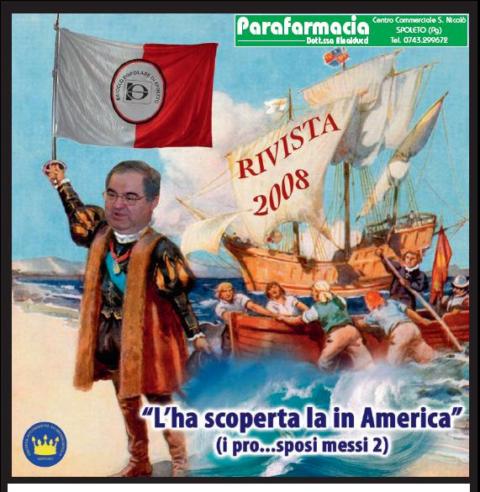 Dieci gli sketch principali della Rivista 2008, oltre al numero centrale: “L'ha scoperta la in America“. “Spoleto 1492, tre caravelle, anzi una ma bella grossa. Tre mini atti musicali ci raccontano di Juvannoforo detto ‘u colombo' e i suoi invitati in un viaggio nauseabonto, alla scoperta del nuovo monto, per dimostrare che è rotondo”. Pinchi assicura che il matrimonio dell'anno è solo una scusa per parlare degli “spoletini alla scoperta del nuovo mondo”. Ma c'è da crederci?I “pro…sposi messi” non è l'unico sequel della Rivista: in scaletta c'è anche “SPOrtKART 2“, che ha come ambientazione il noto negozio cittadino.