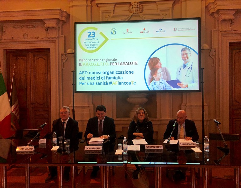 “In Umbria si potenzia l’offerta dei servizi sanitari sul territorio: sono ormai operative 38 Aft – Aggregazioni funzionali territoriali, presidi che assicurano una apertura ininterrotta per dare risposte immediate e sempre più complete ai bisogni di salute dei cittadini che avranno a disposizione 24 ore su 24, sette giorni alla settimana, le competenze dei medici di medicina generale e della continuità assistenziale e di infermieri di territorio, senza dover ricorrere ai Pronto soccorso ospedalieri”. Lo ha sottolineato l’assessore regionale alla Salute, Coesione sociale e Welfare, Luca Barberini, aprendo stamani alla Sala Brugnoli di Palazzo Cesaroni l’incontro di presentazione delle Aft, che si è concluso con l’intervento della presidente della Regione Umbria, Catiuscia Marini, al quale hanno preso parte medici, esperti, dirigenti delle Aziende sanitarie e ospedaliere e della Regione Umbria, coordinatori delle Aft delle Usl Umbria 1 e 2.