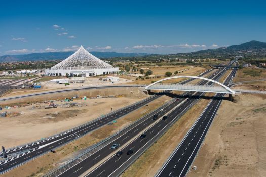 Questo ponte, con una luce di 83 metri, scavalca l’autostrada e le complanari; assicura così maggiore sicurezza e fluidità al traffico. Il suo varo a spinta, con l’impalcato assemblato in cantiere, ha permesso di minimizzare l’impatto sulla viabilità durante le fasi di costruzione. E’ stato creato un nuovo asse in variante plano-altimetrica rispetto all’attuale configurazione di via di Passo Lombardo; sono stati eseguiti tutti gli impianti necessari per le nuove infrastrutture. Completato anche l’intervento di sistemazione e riqualificazione dell’area situata tra la rotatoria di via dell’Archiginnasio, via Guido Carli e l’autostrada Roma-Napoli. L’area, adiacente al complesso delle Vele e al cantiere per il collegamento autostradale A1-Compendio Tor Vergata, era caratterizzata da cumuli di terreno, avvallamenti e dislivelli, utilizzata in modalità impropria per la pratica del motocross. L’intervento ha previsto lavori di movimentazione terra per eliminare i dislivelli e mettere in sicurezza l’intera zona. Con operazioni di scavo, rinterro e rimodellazione del terreno, è sorta così un’area sicura di circa 216.000 mq, per accogliere i pellegrini del Giubileo dei Giovani 2025. Per incrementare la sicurezza e ottimizzare la fruibilità delle strade è stata realizzata una viabilità perimetrale di circa 2 km, con l’aggiunta di rampe di accesso e collegamento. L’investimento complessivo ammonta a 28,4 milioni di euro. Per realizzare l’opera sono stati scavati 28.213,74 metri cubi di terreno e impiegati 350 metri cubi di pali di fondazione.