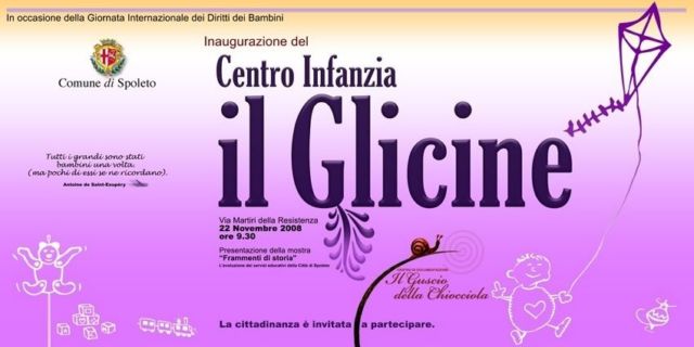 Sabato 22 novembre, in occasione dell'inaugurazione del Centro infanzia “Il Glicine” verranno realizzati laboratori e attività per bambini e famiglie tra i 2 e i 6 anni.Nella mattinata, dopo il saluto delle autorità e l'inaugurazione della mostra “Frammenti di storia” – L'evoluzione dei servizi educativi della Città di Spoleto, avrà luogo l'atelier dell'artista “Kamishibai – Inventare & Diventare con la valigia dei racconti” a cura di Artebambini, un progetto educativo che invita a raccontare e fare teatro minimo a scuola, in biblioteca, in ludoteca, a casa.