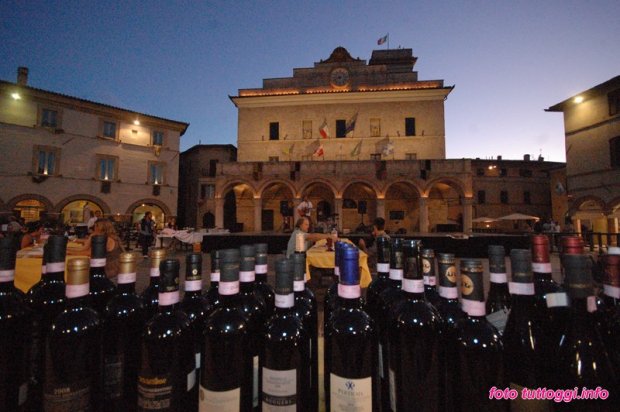 Con il far della notte l'attenzione si sposta in Piazza, dove, appunto, troneggia una tavolata con decine di bottiglie della miglior produzione locale di Sagrantino, con tanti sommelier intorno a stappare, degustare e spiegare ai numerosi commensali le caratteristiche di questa o quella etichetta. Ottimo il vino, squisita la cena, suggestiva la location e azzeccata pure la colonna sonosra di questa splendida serata, con l'esibizione umplugged dell'australiano Mike Warren e poi il rock acustico dei Natenand The Dagos.