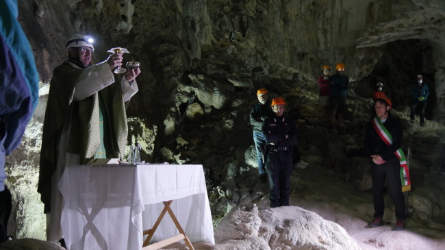 Una consuetudine nata nel 2009 dall’idea del vescovo emerito di Gubbio, mons. Mario Ceccobelli, che si è ripetuta ogni anno, tranne nel 2020 a causa dell’emergenza sanitaria e delle prescrizioni anti contagio da Covid. È la celebrazione della santa messa nelle profondità delle grotte del monte Cucco nella data dell’11 luglio, memoria liturgica di san Benedetto da Norcia.