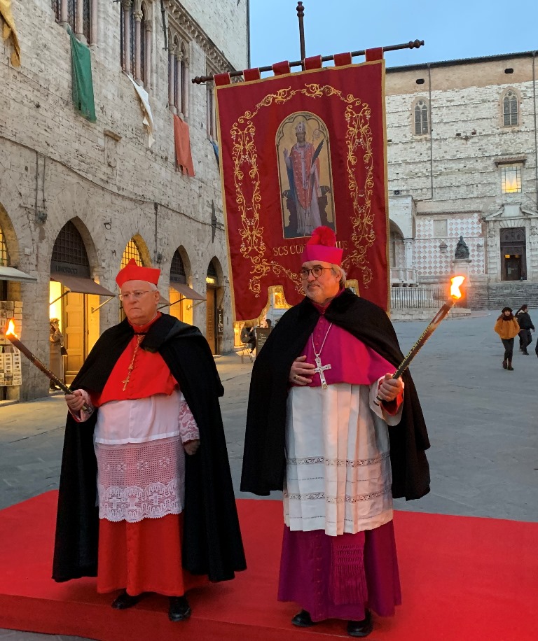 Come allora, ieri sera tutta la città era presente in centro storico per onorare il vescovo e martire Costanzo. Subito dopo l’accensione delle fiaccole, il corteo si è avviato verso la basilica eretta nel luogo in cui –secondo la tradizione- San Costanzo fu sepolto dopo il martirio, avvenuto a Foligno. Ad aprirlo i figuranti in costume di Perugia 1416, con i cinque Magnifici Rioni cittadini, il Gruppo Balestrieri di Assisi con chiarine e tamburi che hanno scandito i tempi della processione e della preghiera lungo il percorso, la Compagnia del Grifoncello, la Confraternita del Santissimo Sacramento di Ponte Valleceppi 1746, quella di San Giacomo e la Confraternita del Santo Anello, infine la reggenza comunale. Ogni Rione ha portato uno dei doni da offrire al Santo: il cero da parte di Porta Sant’Angelo, la corona d’alloro da parte del Rione di Porta Eburnea, l’incenso da parte di Porta San Pietro, il torcolo di San Costanzo da parte di Porta Sole, e, infine, la brocca di vin santoda parte del Rione di Porta Santa Susanna.