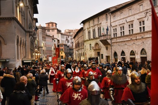 In questo luogo di culto dove sono conservate le reliquie del Santo si è conclusa la processione con i lumi tenuti tra le mani da centinaia di fedeli, animata dalle rappresentanze dei Figuranti in costume medioevale delle cinque Porte dei Rioni di “Perugia 1416” e dei cortei storici di Assisi e Città della Pieve.