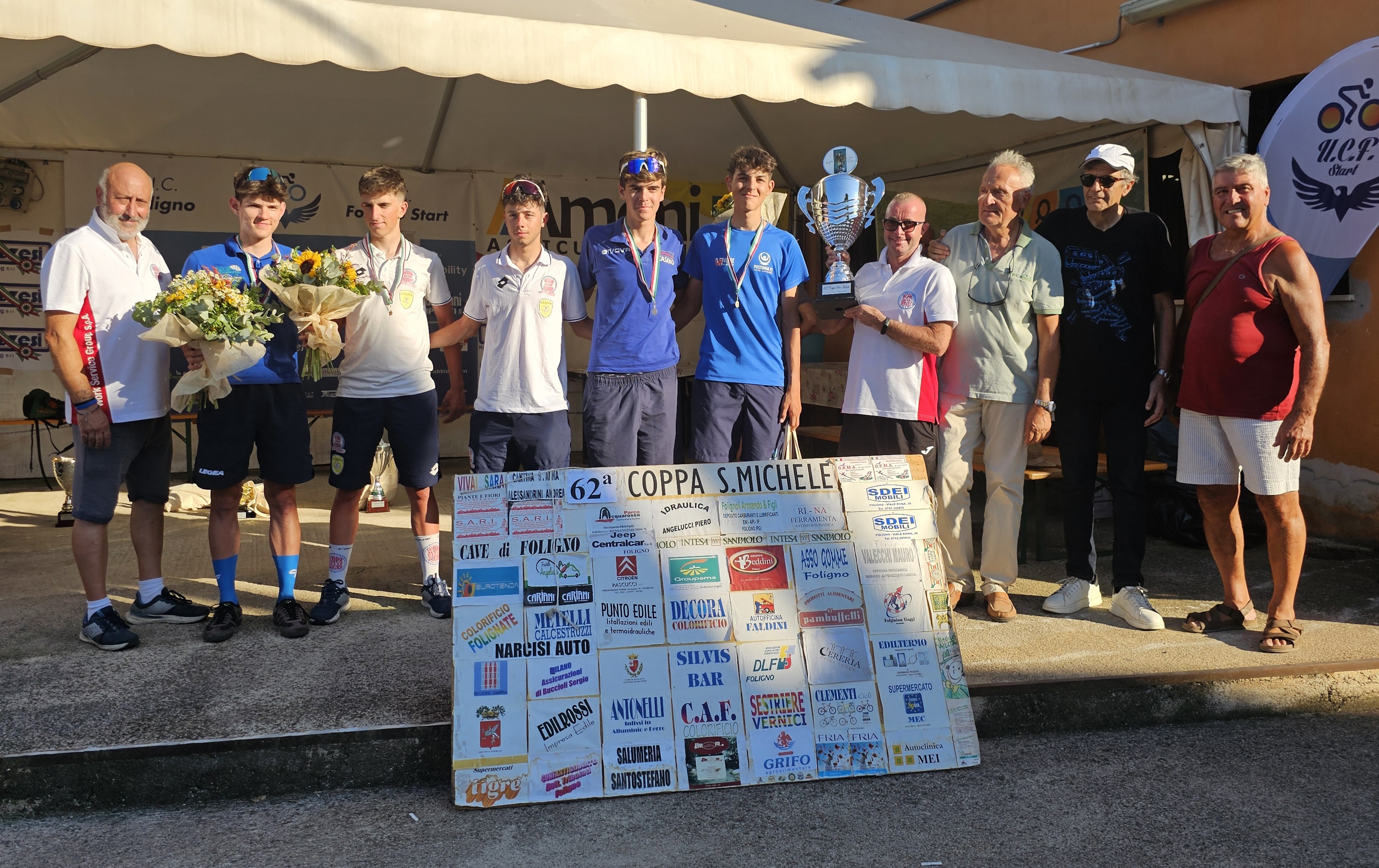 Un vincitore più che degno del prestigioso albo d’oro di una corsa che ha saputo, anche in questa sua veste estiva, riscuotere ampi consensi dai partecipanti e dagli appassionati. Grande soddisfazione a livello organizzativo per la SC Maria Giuliana e per l’Unione Ciclistica Foligno, con quest’ultima protagonista fino all’ultimo anche in gara con la 6° piazza di Giacomo Serangeli (passato in testa anche sul GPM di Montefalco) e la 10° di Alessandro Caon. Per quel che concerne di premi simbolo della manifestazione Santiago Ferraro si è quindi aggiudicato la Medaglia d’Oro in memoria di Peppe Casini e Mario Proietti, mentre la GS Work Service Coratti ha alzato, in quanta squadra del vincitore, la sempre magnifica coppa in onore di San Michele. Sul podio spazio anche per Damiano Buttarazzi e Nicolò Pizzi, transitati per primi rispettivamente sui GPM di Montepennino e di Pietrauta, nel primo caso dividendosi i due passaggi di giornata. A officiare la ricca cerimonia protocollare una nutrita schiera di ospiti e autorità, capeggiata dal vicepresidente del CR Umbria Roberto Cocchieri, intervenuto a fine gara in vece del presidente Massimo Alunni, che si è invece intrattenuto fino al termine della competizione. Presenti, infine, Marino Casini (responsabile della manifestazione e patron della SC Maria Giuliana), Piero Bordoni (presidente Pro Loco Cave), Ernelio Massarucci (Presidente Comitato Provinciale Terni FCI), Lucio Saccarelli (consigliere e responsabile logistica CR Umbria FCI) e Carlo Moriconi (responsabile affari esterni CR Umbria).