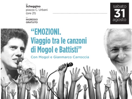 I più grandi successi di Lucio Battisti cantati da Gianmarco Carroccia accompagnato da un’orchestra di 16 elementi e raccontati dall’autore in persona, Mogol. Si chiama “Emozioni” lo spettacolo musicale che andrà in scena sabato 31 agosto a Scheggino nell’ambito della rassegna “La Voce della Terra”.