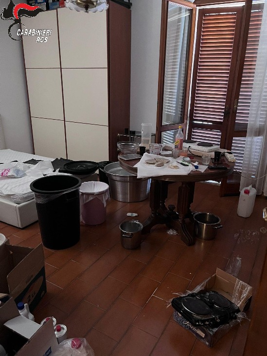 All’interno del laboratorio sono stati rinvenuti circa 7,4 kg di cocaina lordi (fra quella già lavorata e quella ancora in pasta grezza), varie tipologie di solventi chimici e attrezzature utilizzate per la raffinazione della droga, una pressa idraulica per la realizzazione dei panetti da 1 kg con impresso il logo B, nonché alcuni grossi recipienti in plastica contenenti una miscela di solvente e cocaina ancora in soluzione. Oltre allo stupefacente e al materiale utilizzato per la sua lavorazione, i carabinieri hanno sequestrato i cellulari degli arrestati, nonché varia altra documentazione utile alle indagini, fra cui due manoscritti, in spagnolo e in italiano, contenenti le procedute dettagliate per l’estrazione e la lavorazione della cocaina in pasta.