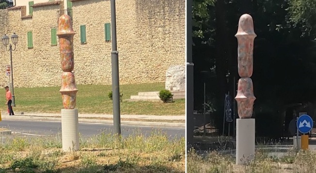 L’opera, che unisce la tradizione ceramica con la verticalità delle antiche architetture tifernati – da quel preciso punto si vedono lo splendido scorcio con torre civica, campanile rotondo e torre dell’orologio -, è finita al centro delle attenzioni non tanto per i suoi riferimenti artistici, quanto per la forma che, evidentemente, richiama tutt’altro, suscitando ironie, critiche e ondate di commenti sui social.