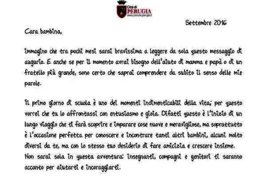 “Il primo giorno di scuola – continua Romizi – è uno dei momenti indimenticabili della vita: per questo vorrei che tu lo affrontassi con entusiasmo e gioia. Difatti questo è l’inizio di un lungo viaggio che ti farà scoprire e imparare cose nuove e meravigliose, ma soprattutto è l’occasione perfetta per conoscere e incontrare tanti altri bambini, alcuni molto diversi da te, ma con lo stesso tuo desiderio di fare amicizia e crescere insieme. Non sarai sola in questa avventura: insegnanti, compagni e genitori ti saranno accanto per aiutarti e incoraggiarti. Oggi tu e i tuoi compagni siete bambini di prima elementare, ma io già vi vedo come i costruttore del futuro. Costruttori di bellezza, di saperi e di pace. La città dove vivete e crescete, Perugia, è la città della pace e la meta di tanti giovani che vengono qui da ogni parte del mondo per studiare”.