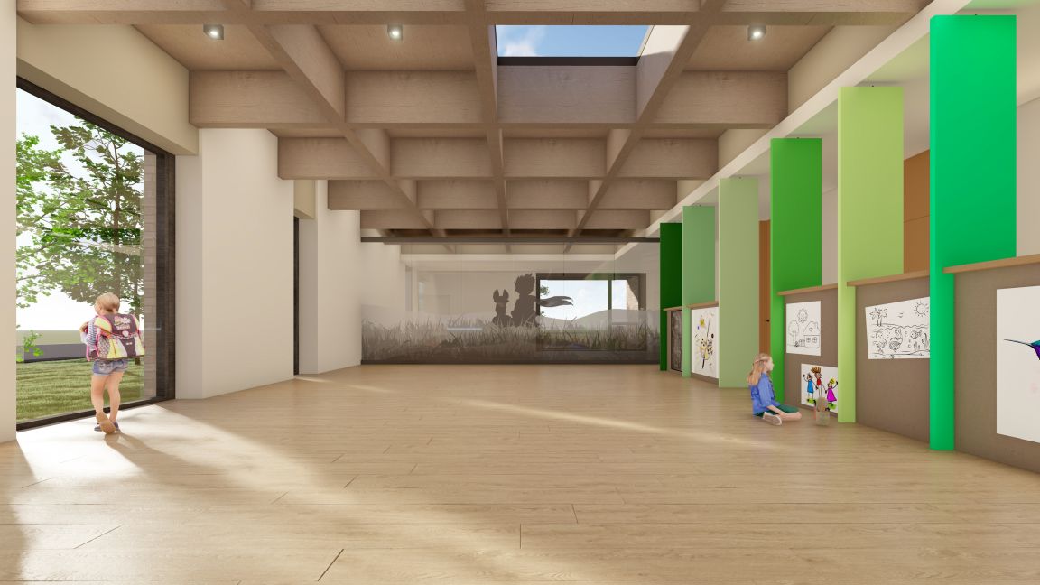 Questo asse, che collega i due edifici, è anche quello che demarca, all’interno dell’area di progetto, il “confine” fra la parte “pubblica”, quella degli spazi verdi accessibili del complesso, connessa al viale pedonale interno e dunque “aperta” alla città, e quella invece “privata”, destinata solo ai bambini dell’asilo nido e della scuola dell’infanzia e che rappresenta l’insieme dei loro luoghi di esperienza, apprendimento e gioco.