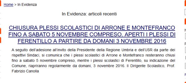 Nonostante questa seconda nota della Regione, il dirigente della scuola di Ferentillo “G. Fanciulli”, il prof. Fabrizio Canolla, ha pubblicato sul sito ufficiale dell’istituto una circolare per rendere noto che: “A seguito dell’adesione all’invito della Presidente della Regione Umbria e dell’USR da parte dei rispettivi Sindaci, si comunica che i plessi scolastici di Arrone e Montefranco resteranno chiusi fino a sabato 5 novembre compreso, mentre i plessi scolastici di Ferentillo, su indicazione del Comune, riapriranno regolarmente da domani, 3 novembre 2016”.