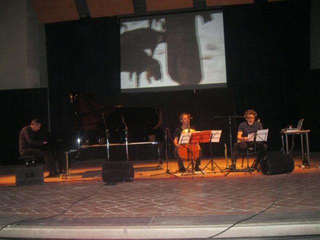 Uno schermo per videoproiettori, un grand piano, un violoncello ed un sassofono sopranino. E' lo scenario minimale – probabilmente l'unico possibile – che si è presentato agli spettatori, non molti per la verità, alla puntuale apertura della porta d'accesso all'Auditorium.