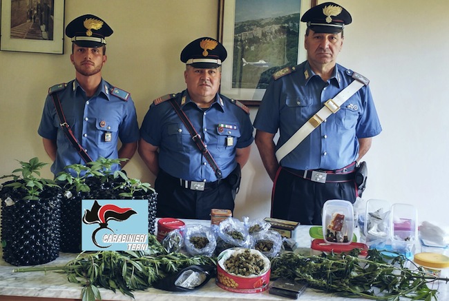 I fatti – I militari della Stazione di Montecastrilli stavano effettuando un controllo specifico, quando, in uno dei locali del laboratorio che era stato ‘blindato’ con una robusta porta in ferro dotata di serratura e lucchetto, hanno scoperto la serra artigianale indoor di canapa indiana. I Carabinieri, alla presenza del titolare, un 47enne del luogo, erano infatti stati attirati dall’intenso ed acre odore, tipico della marijuana, proveniente dal quella stanza così ben custodita. Lì hanno trovato una struttura appositamente adibita a serra, ricoperta da telo rifrangente e fornita all’interno di lampade, tubi di aereazione ed antizanzare, dove erano in fase di crescita 5 vasi con altrettante piante di cannabis sativa. Nello stesso locale e negli altri del laboratorio i militari hanno sequestrato complessivamente un’ottantina di grammi di marijuana. La perquisizione successiva effettuata all’interno della casa del complice ‘dal pollice verde’, un 45enne anche lui del posto, i Carabinieri hanno trovato altre due piante di canapa cresciute ed in essiccazione, 200 grammi di marijuana e 60 di hashish già suddivisi in dosi, insieme all’occorrente per la pesatura ed il confezionamento di altre dosi e di materiale vario per la coltivazione e l’essiccazione delle piante.