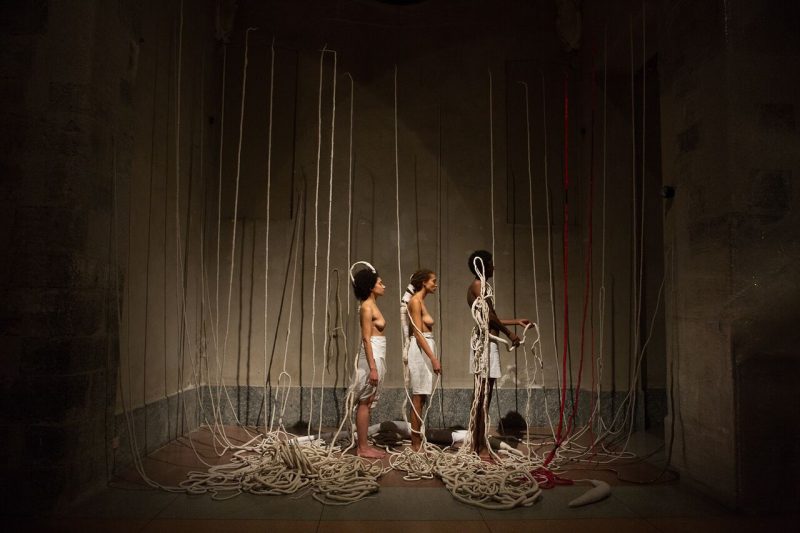 Questa materia tessile, che dà corpo all’installazione, è protagonista fondamentale della performance, e mezzo che l’artista usa per “dare vita e parola alla materia”, ottenendo una sintesi artistica tra corpo, tessitura e architettura.