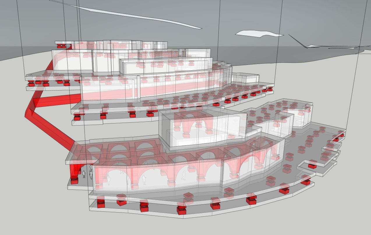 La prima sarà realizzata “Sotto le mura” e l’altra “Sopra le mura” per un totale di circa 6mila metri quadri e una spesa ipotizzata di 6 milioni di euro. La fondazione è una platea in cemento armato spessa poco meno di un metro e dotata sulla sommità di sostegni dove sono installati gli isolatori. Lo spazio libero tra fondazione e piastra isolata (1 metro circa) sarà utilizzato per le operazioni di ispezione e manutenzione e per il posizionamento degli impianti sotterranei.