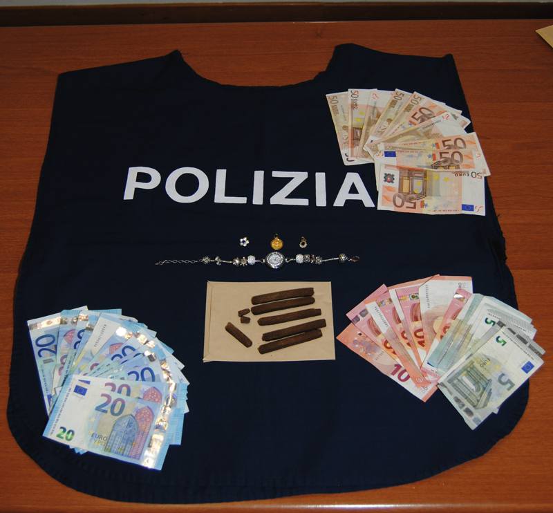 Gli agenti si sono così avvicinati ai due per identificarli, notando che entrambi si dimostravano nervosi e dall’atteggiamento elusivo. Hanno così deciso di condurli in Questura. L’uomo, intuendo di non poter più sottrarsi al controllo, all’improvviso ha iniziato ad inscenare un malore, inducendosi conati di vomito, sputando ed asserendo di essere diabetico. Di fronte a quella reazione, la compagna ha chiesto che gli venisse somministrata dell’acqua che avrebbe risolto la crisi. I due hanno rifiutato le cure del 118 e, superato il presunto malore, sono stati entrambi perquisiti; in una tasca del giubbotto dell’uomo, i poliziotti hanno trovato un pacchetto di sigarette contenente hashish per un peso di oltre 20 grammi. Inoltre, sempre addosso al nordafricano, distribuita nelle tasche e nel portafoglio, è stata trovata la somma di 930 €, con ogni probabilità ricavato dallo spaccio ed alcuni monili (un orologio ed un paio di orecchini) dei quali non sapeva indicare la provenienza, ma che probabilmente erano stati rubati.