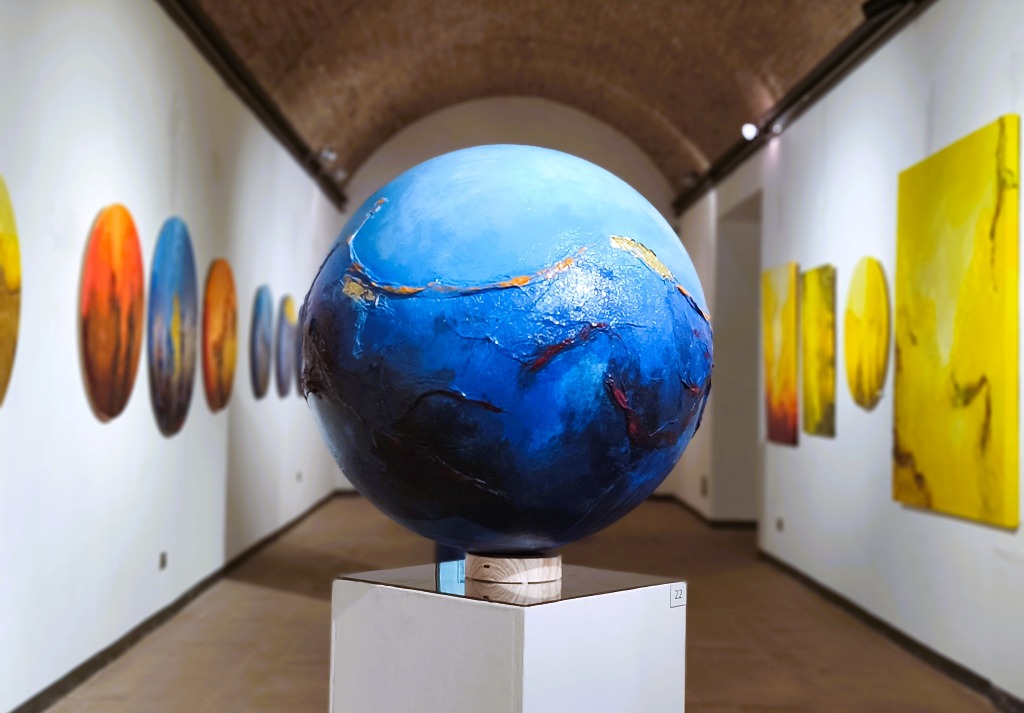 Spiegano i curatori Giancarlo Bonomo e Raffaella Rita Ferrari: “Oltre a quelle percepite, alcune teorie contemporanee ipotizzano la presenza di ulteriori dimensioni denominate Multiverso, ovvero una costellazione indefinibile di universi non osservabili che superano la nostra concezione di spazio e tempo. Un’intuizione che risuonava già nel pensiero filosofico di Giordano Bruno con la celebre dissertazione sugli infiniti mondi. L’Ente umano, quale Essere consapevole e senziente, detiene il privilegio di poter concepire e immaginare non solo l’Eterno, ma anche le ragioni che lo determinano, quale parte di un indefinibile Disegno cosmico. Potremmo asserire che ogni forma, teorema o espressione intelligente contenga un frammento di Conoscenza e che, probabilmente, noi stessi siamo lo strumento con cui un presunto Universo multidimensionale può comprendere se stesso. Le opere in mostra a Montefalco riflettono, come specchi, paesaggi di terra e immensità celesti tra realismo e pura astrazione, in un dialogo ideale tra visibile e invisibile”.