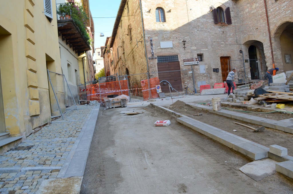Gli interventi sono stati ultimati in via Roma, piazza Kennedy, via Sant’Anna, via Marconi, via Maddalena, via del Seminario Vecchio, via del Mattatoio, via Torri di Properzio, via San Saverino, via del Fontanello I, via Fonte del Mastro II, via Madonna della Rosina, via San Martino I, via Mura Vecchie, via Borgo di via Giulia, via delle Mura, via Liberazione; in queste vie si procederà anche al rifacimento dell’illuminazione pubblica.