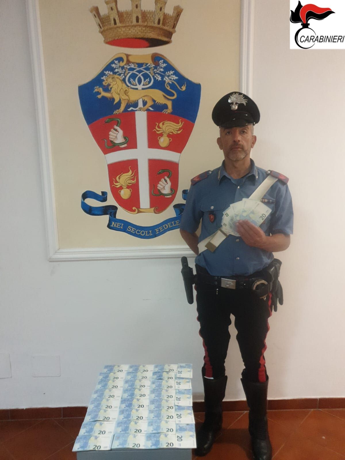 Nel corso delle successive perquisizioni, personale, veicolare e domiciliare, sono state rinvenute ulteriori 40 banconote da 20 euro, con il medesimo numero di serie di quelle spese ad Antrodoco.