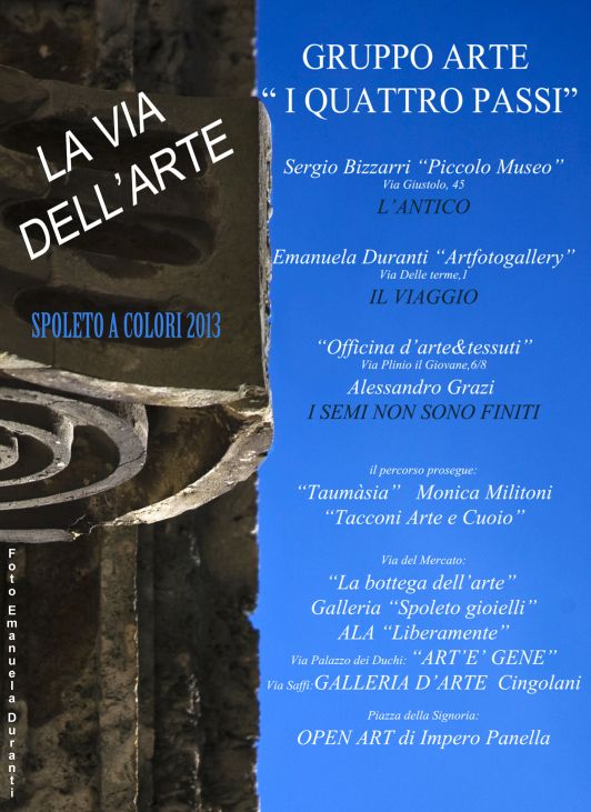 Prosegue l’attività culturale e promozionale del Gruppo d’Arte “I Quattro Passi”, costituitosi su iniziativa di Sergio Bizzarri (Piccolo Museo), Emanuela Duranti (Artfotogallery) e Maria Giuseppina Caldarola (Officina d’arte&tessuti). Dopo il successo conseguito per la partecipazione alle iniziative promosse dal Comune di Spoleto in occasione della Giornata Internazionale della Donna, il Gruppo è ora impegnato nel fornire il proprio contributo al buon esito di “Spoleto a colori”.