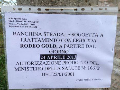 A scatenare le ire dei grillini, gli avvisi che l’A.Se. ha recentemente apposto in alcune frazioni di Spoleto, tra cui Icciano, prontamente segnalati da alcuni residenti che, legittimamente, si sono interrogati sulla possibile pericolosità del prodotto scelto per diserbare . Il Rodeo Gold, appunto, che verrà irrorato sul verde delle campagne spoletine a partire dal 24 aprile. “Leggendo il foglietto illustrativo – scrive uno dei segnalatori – se ne avverte la pericolosità e la tossicità per l’uomo, gli animali e le piante che crescono vicine alle banchine stradali e che potrebbero venir danneggiate”.