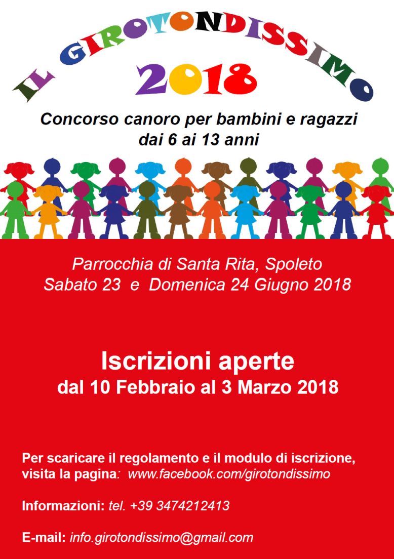 Infatti, basterà un’età tra i 6 e i 13 anni e la residenza o l’iscrizione alle scuole elementari e medie del Comune di Spoleto per potersi iscrivere alla gara canora. I primi 40 che invieranno la loro adesione,concorreranno al Girotondissimo 2018, il 23 e 24 giugno prossimi.