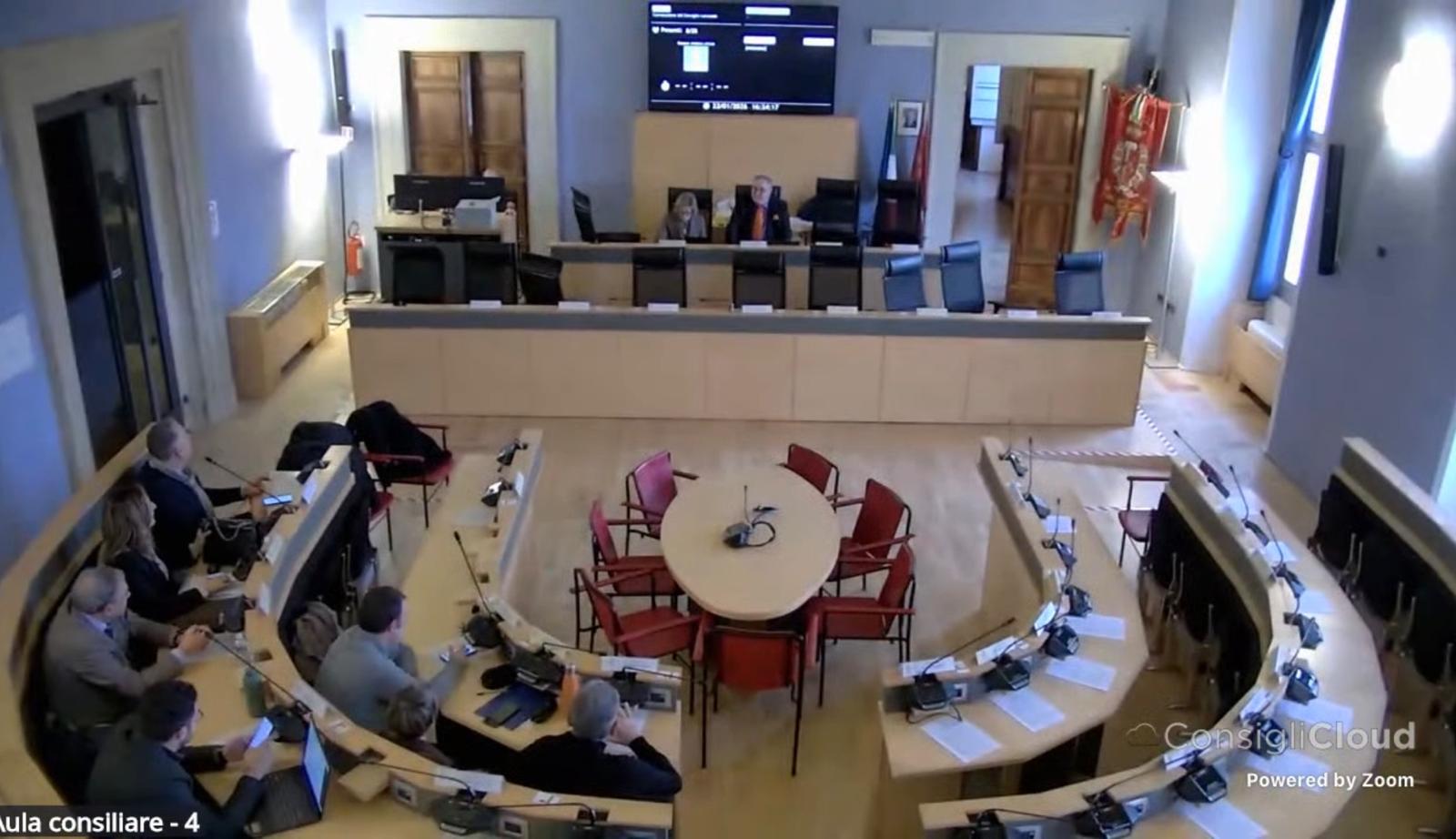 Per la verità molti erano fuori dell’aula – come mostra il fermo immagine qui sotto in cui si intravedono, tra gli altri, il presidente del consiglio Trippetti e il pentastellato Bonanni – a rafforzare la “messa in mora” del sindaco.