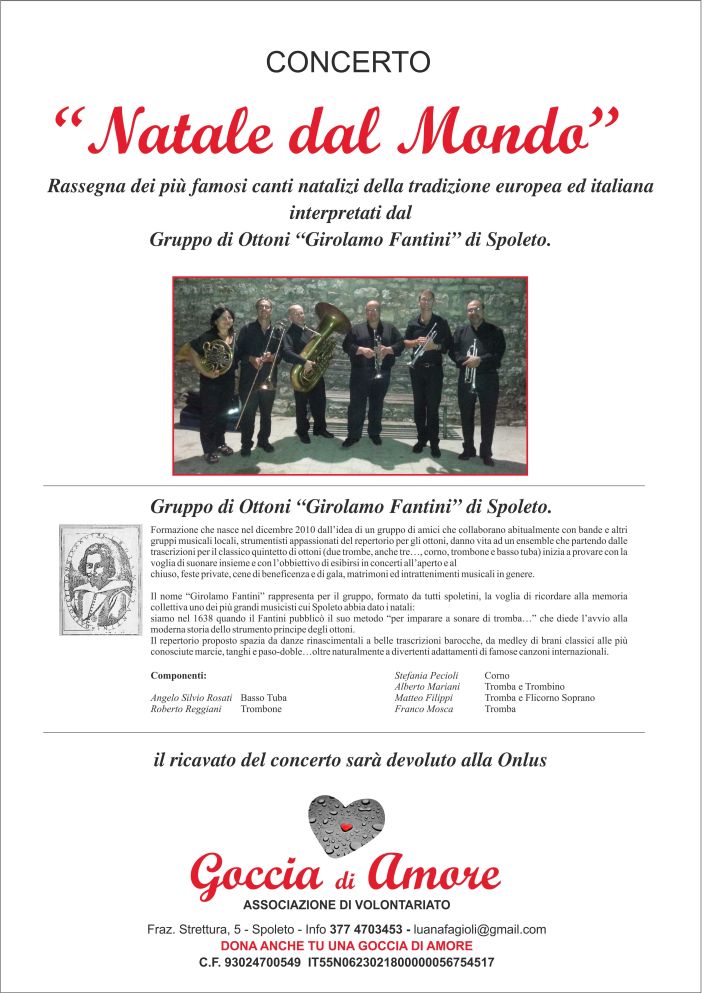 In programma per domenica 20 dicembre, un concerto di beneficenza del Gruppo di Ottoni “Girolamo Fantini” di Spoleto il cui ricavato sarà devoluto alla Onlus GOCCIA DI AMORE, associazione impegnata in una missione umanitaria in Tanzania.