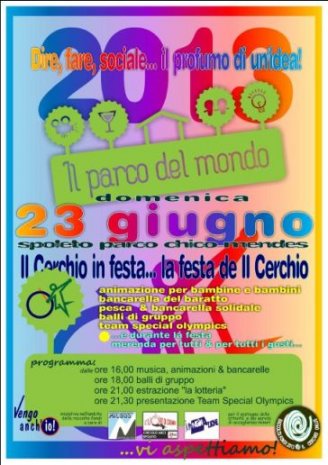 Domenica 23 giugno 2013, presso IL PARCO DEL MONDO (all'interno del Parco Chico Mendes di Spoleto), si terrà la festa annuale della Cooperativa Sociale Il Cerchio “Dire, fare, sociale… il profumo di un'idea!”