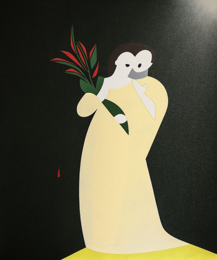 Partendo da questo presupposto, lo Sperimentale è diventato una vera e propria Factory, anche per quelli che si sono imposti come i nuovi esponenti della visual art che operano oramai nei circuiti internazionali. Come nel caso di Ester Grossi nata nel 1981 ad Avezzano con una laurea specialistica presso il DAMS di Bologna; all’attivo prestigiosi riconoscimenti fra i quali Premio Italian Factory 2010, finalista al Premio Cairo 2012, oltre ad essere stata invitata alla 54° Biennale di Venezia per il Padiglione dell’Abruzzo e che espone a Parigi, Colonia, Berlino, e nelle principali città italiane. La collaborazione con il Teatro Lirico Sperimentale parte dal 2011. La direzione del Lirico volle inserire come immagine icona della Stagione un suo lavoro intitolato Stop It! Da questo momento l’ente lirico umbro le ha commissionato tutte illustrazioni originali. Per la 68°Stagione Lirica Sperimentale l’artista abruzzese ha realizzato un lavoro intitolato Carminio, ispirandosi ad una foto della Tosca (messa in scena lo scorso anno dallo Sperimentale), che ritraeva il soprano Chiara Isotton e il tenore Paolo Lardizzone. “La scelta iconografica è stata fatta insieme a Claudio Lepore” afferma Ester “Abbiamo ragionato sull’idea che ci fosse un trasporto fra i due personaggi talmente forte, che ho deciso di tradurlo in un abbraccio che non avesse limite nelle figure dei protagonisti, che sembrano di conseguenza una sola persona. Ho voluto imprimere anche una sorta di movimento al blocco delle figure che simboleggiasse il suono espresso del canto e dalla musica dell’opera. La caduta del fiore che può essere letta anche come una goccia di sangue, richiama invece il dramma che sta per accadere”. ha continuato l’artista. La tecnica utilizzata è quella dell’acrilico e smalto la sensazione di tridimensionalità che riproducesse la sensazione della scena teatrale è data con lo spray per lo sfondo che va ad amplificare l’effetto delle luci.